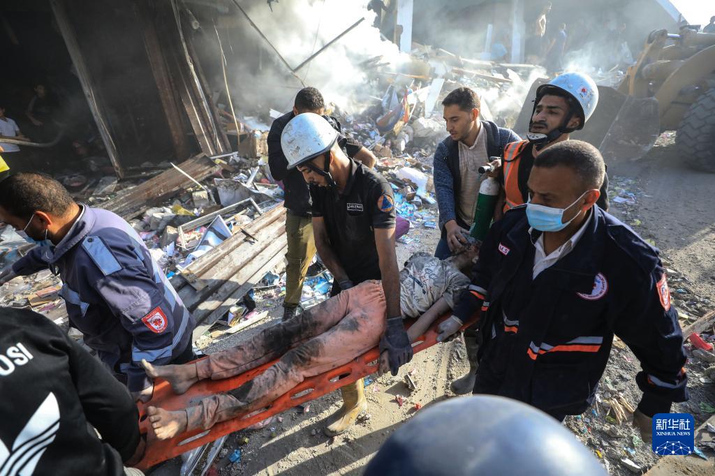 11月7日,在加沙地带南部城市汗尤尼斯,人们在遭到以色列袭击的建筑废墟上实施救援。