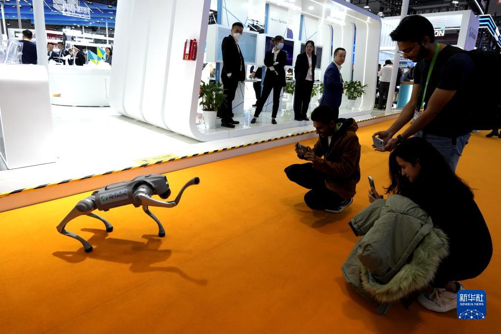 11月7日,在第六届进博会技术装备展区,观众与海克斯康展示的智能机器狗互动。