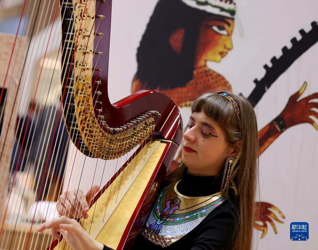 11月6日,一名女子在2023年英国伦敦世界旅游交易会埃及展区表演。