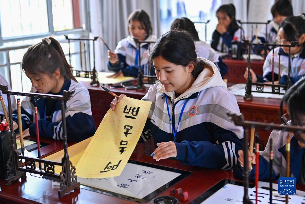 在新疆阿克陶县雪松中学,“红杜鹃”书法社团的学生在练习书法(11月7日摄)。