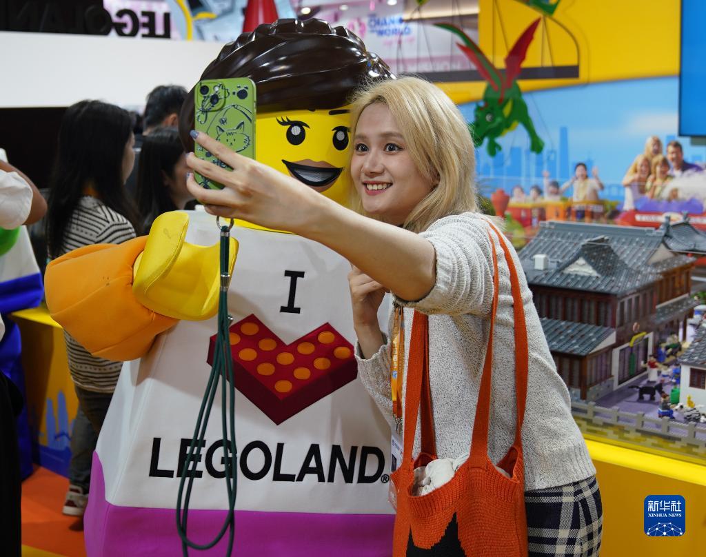 11月7日,在第六届进博会消费品展区乐高集团展台,参观者与乐高人偶合影。
