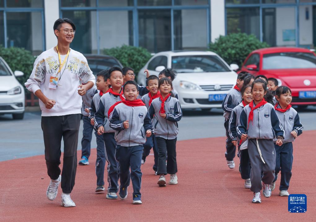 11月8日,湖州市月河小学教育集团吉山校区的学生们在老师的带领下进行慢跑。