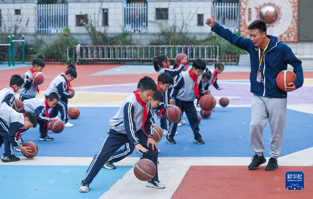11月8日,湖州市月河小学教育集团吉山校区的学生们在老师的带领下参加篮球训练。