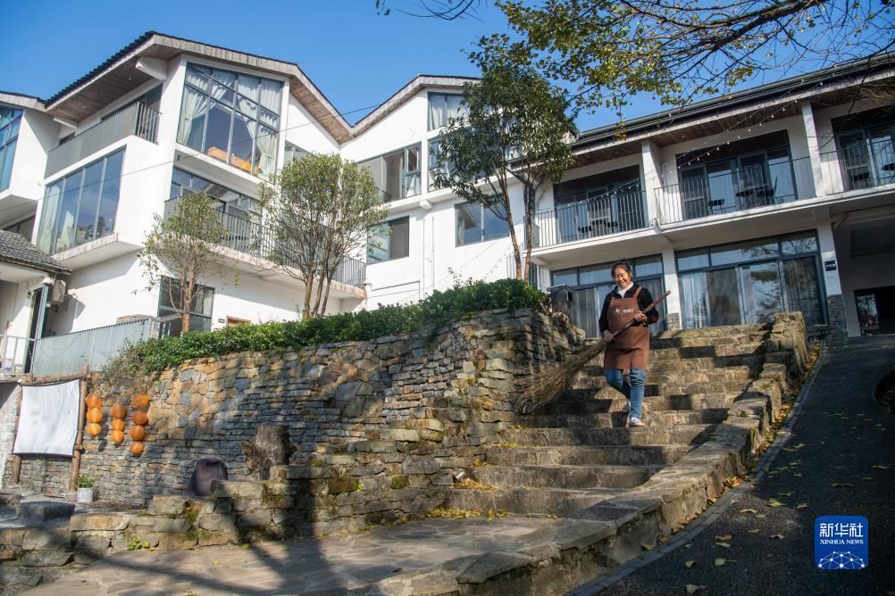 11月7日,在“178环线”上的一家名为“银杏树下的民宿”内,工作人员进行清扫工作。