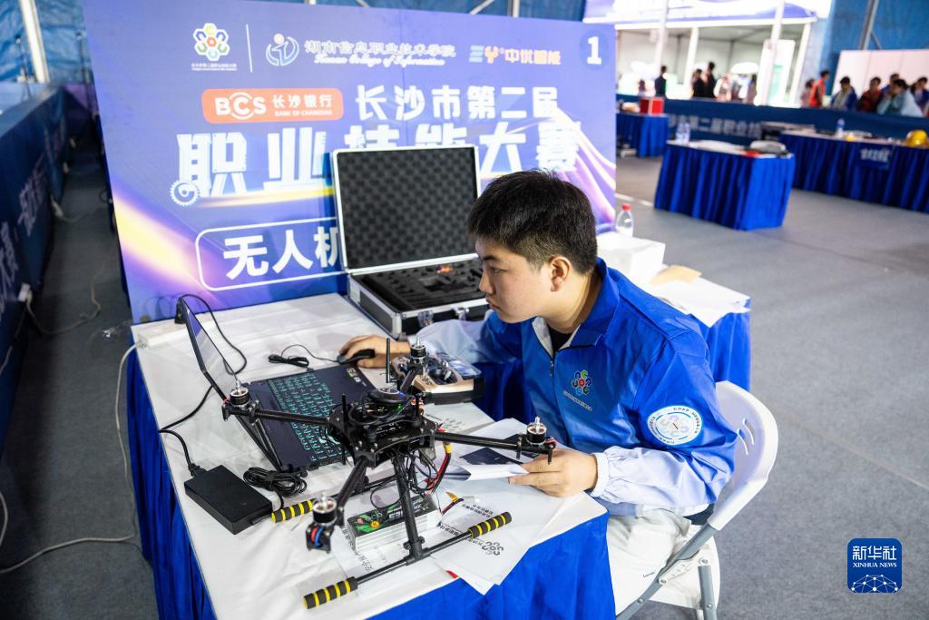 11月8日,在长沙贺龙体育中心,参赛选手在进行无人机装调检修项目的比拼。