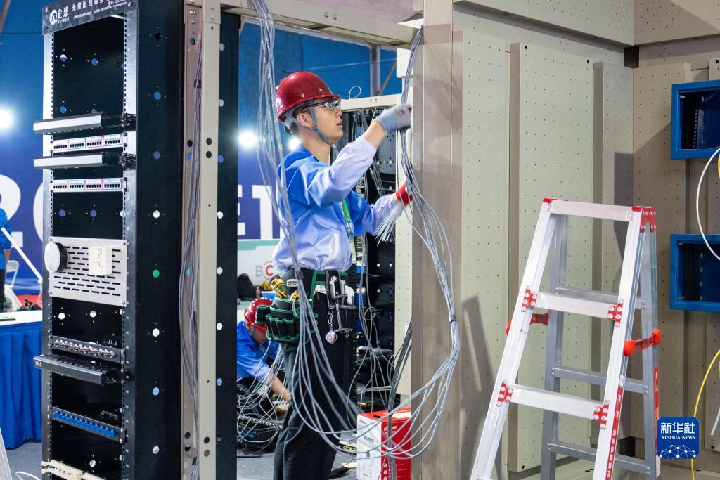 11月8日,在长沙贺龙体育中心,参赛选手在进行信息网络布线项目的比拼。