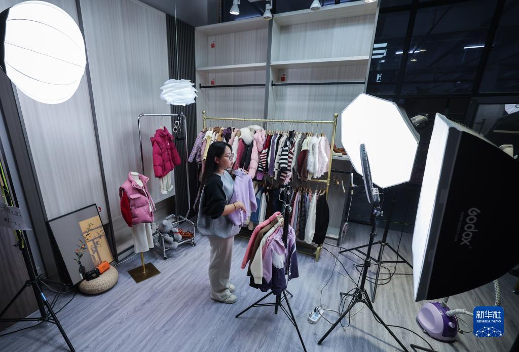 11月8日,在位于织里镇的湖州织里煜果果制衣厂直播间内,工作人员进行“双11”电商直播。