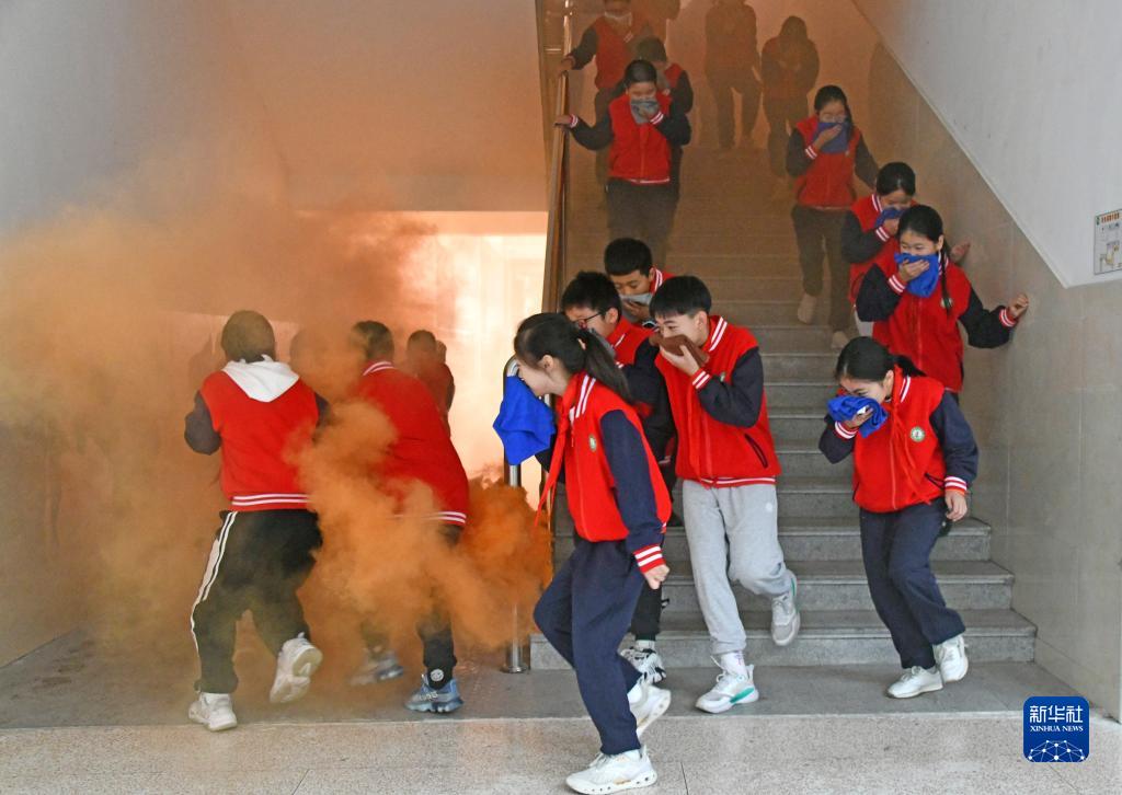 11月8日,浙江省台州市仙居县安洲小学学生在进行火灾逃生演练。
