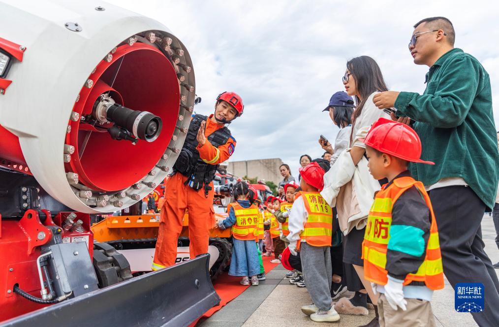 11月8日,在浙江省温州市世纪广场消防宣传月活动现场,消防员向市民展示消防救援器材。