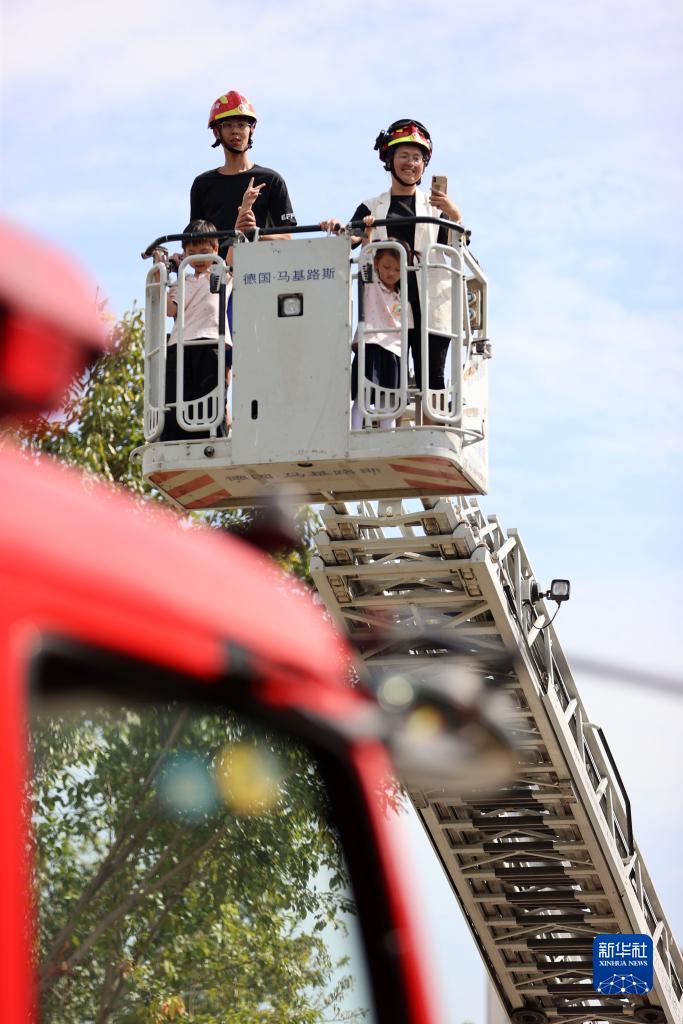 11月8日,在福建省厦门市翔安区消防宣传月启动仪式现场,小朋友和家长体验消防云梯车。