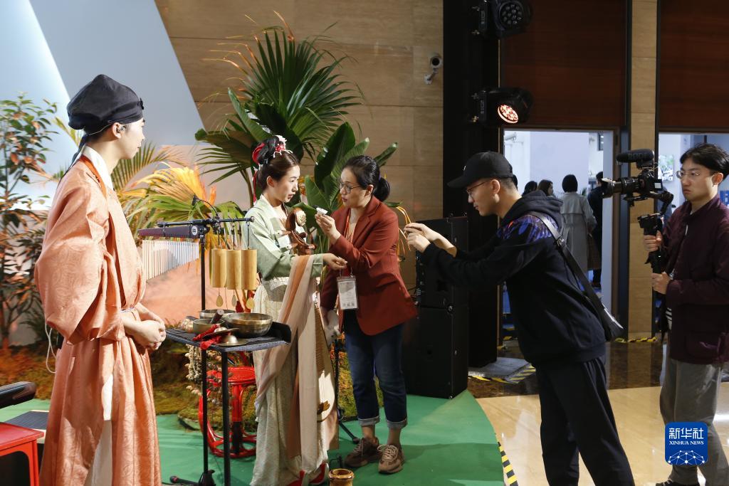 11月8日,在进博会新闻中心,记者在民族室内音乐会后进行采访。