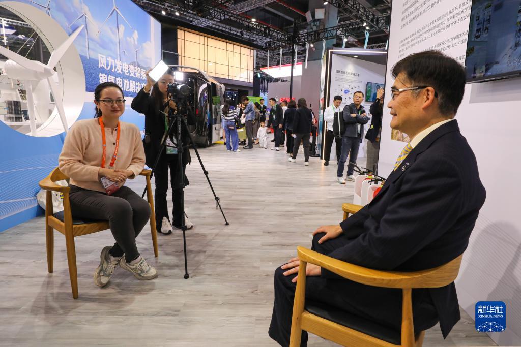 11月7日,新华社记者在第六届进博会消费品展区采访松下控股株式会社全球副总裁本间哲朗。