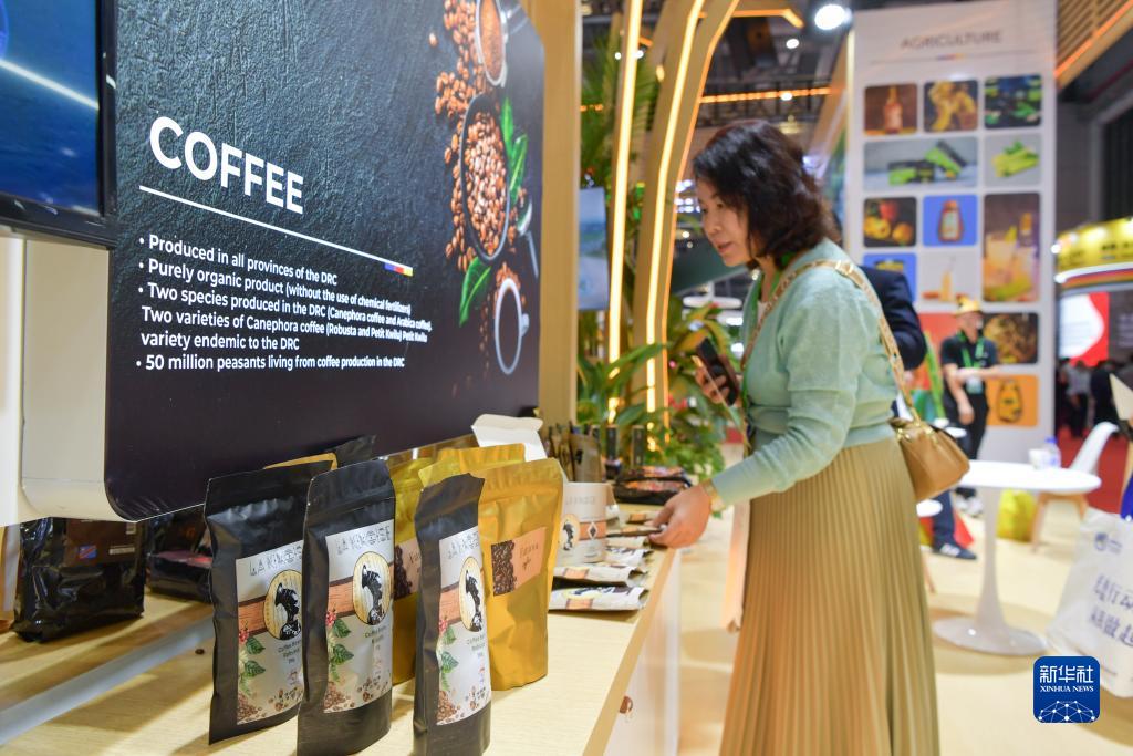 11月8日,在第六届进博会国家展刚果民主共和国馆,观众在了解咖啡产品。