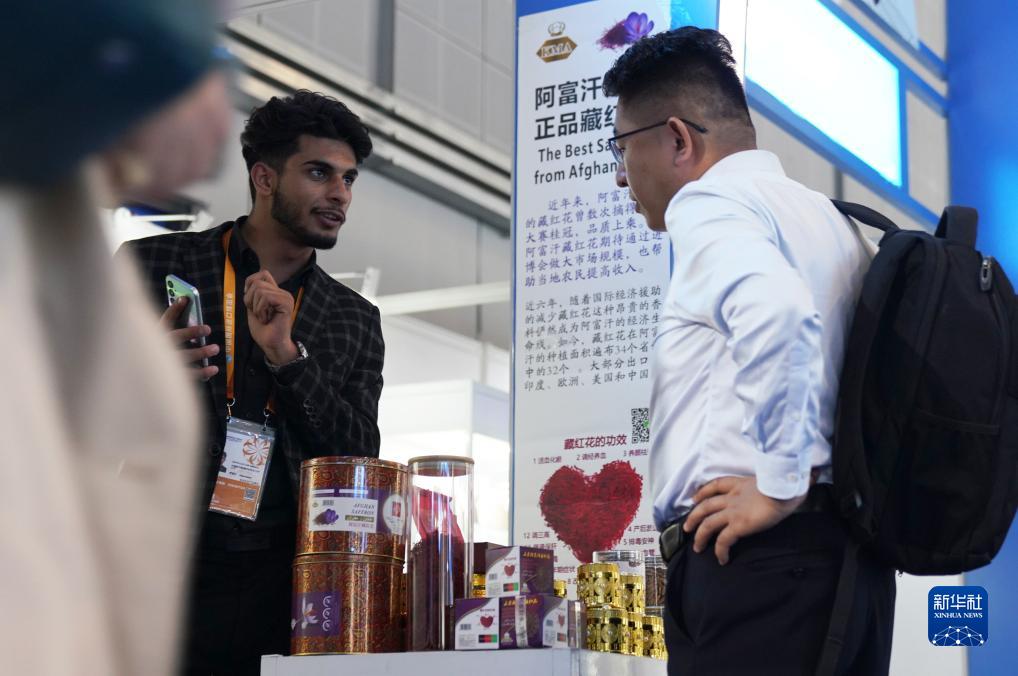 11月8日,在第六届进博会食品及农展品展区,参观者在一家阿富汗展台了解藏红花。
