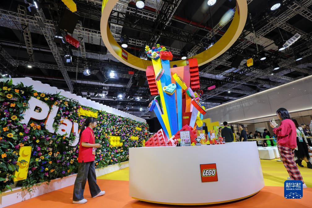 11月8日,游客在第六届进博会消费品展区参观乐高展台。