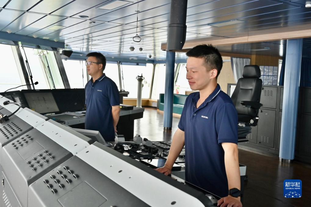 11月8日,水手杜祥磊(右)和大副陈冬林在“雪龙2”号驾驶台值班。