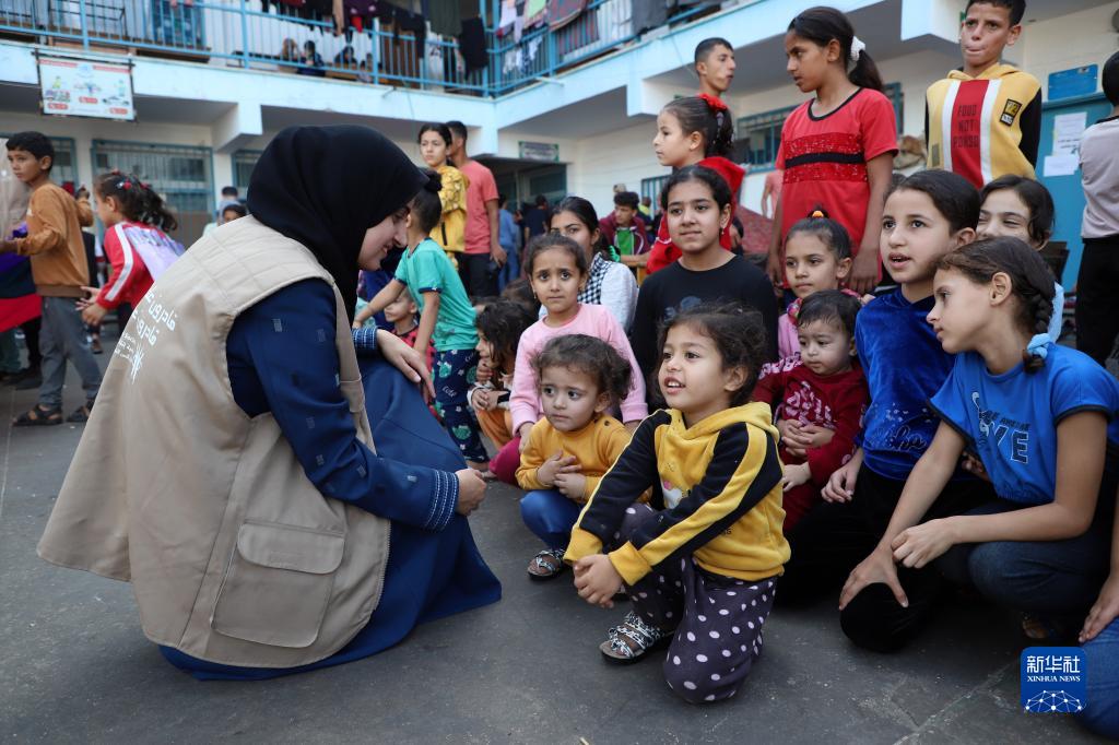 当日,在加沙地带南部城市汗尤尼斯的一所联合国近东巴勒斯坦难民救济和工程处附属学校内,当地志愿者组织多种活动,关爱流离失所的儿童,抚慰战事创伤。新一轮巴以冲突爆发一个月来,加沙地带已有超过1万人死亡,其中大约40%是儿童。