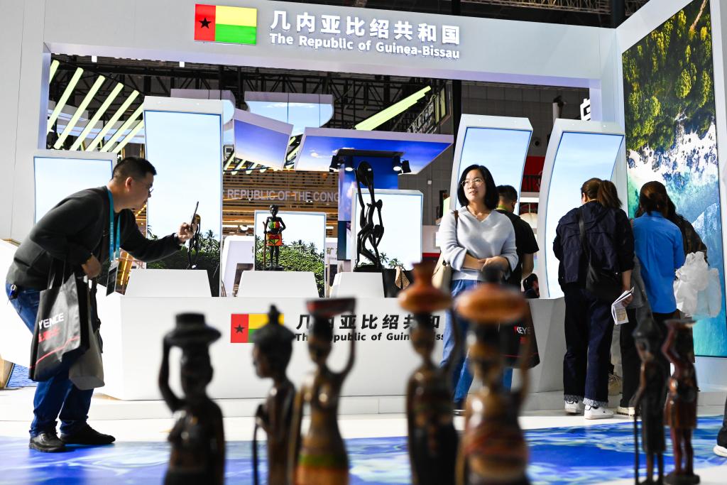 11月8日,在第六届进博会国家展区,观众在巴哈马展台参观。