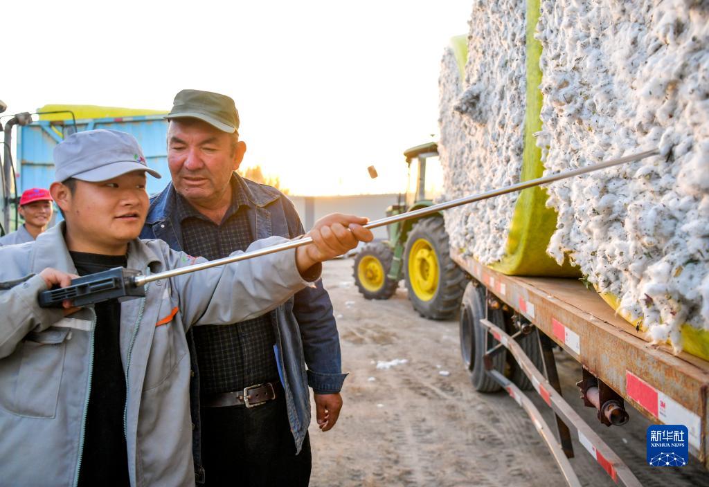 在新疆尉犁县一家棉花加工厂外,尔肯(右)陪着工作人员检测自家棉花湿度(11月1日摄)。