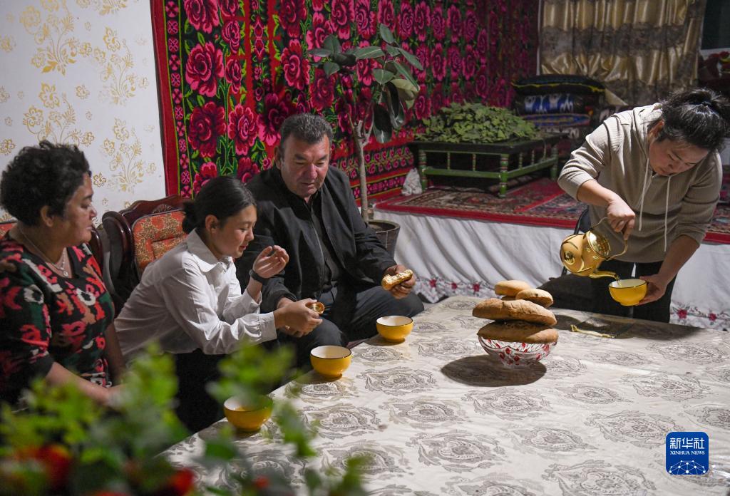 在新疆尉犁县巴西买里村,尔肯(左三)和家人在家中准备吃晚饭(10月20日摄)。