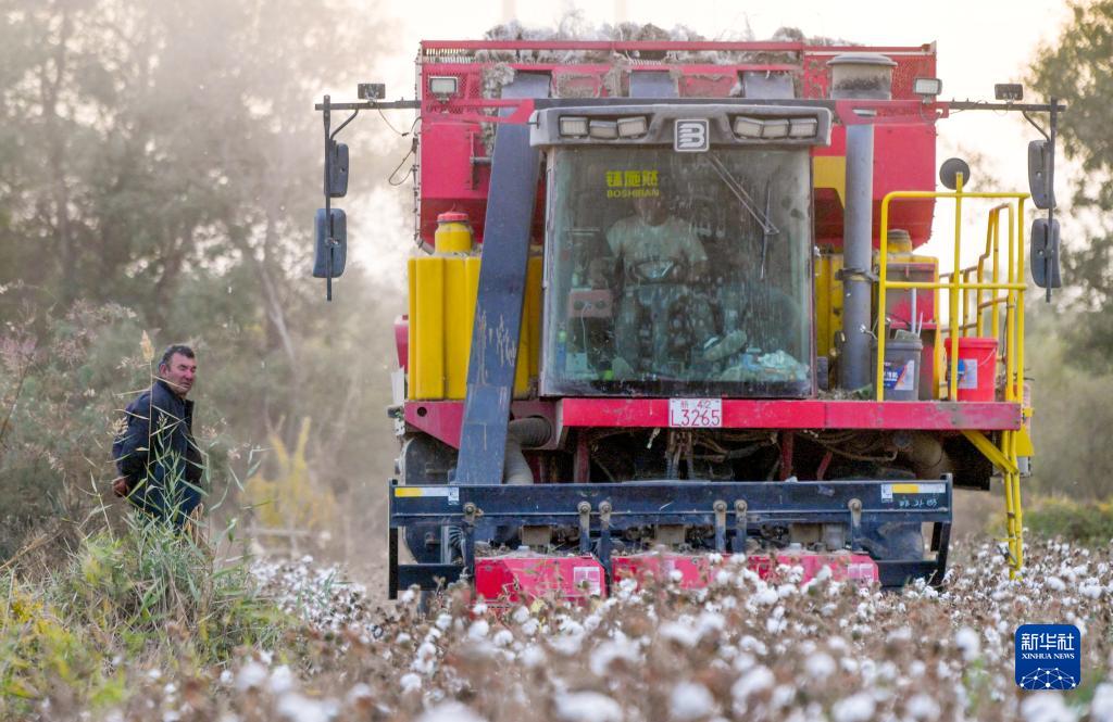 在新疆尉犁县巴西买里村,尔肯在自家的棉田中查看采棉机作业(10月20日摄)。