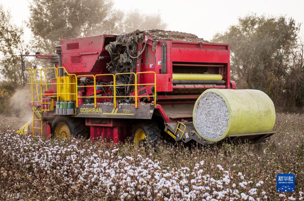 在新疆尉犁县,农机手驾驶采棉机打包棉包(10月20日摄)。