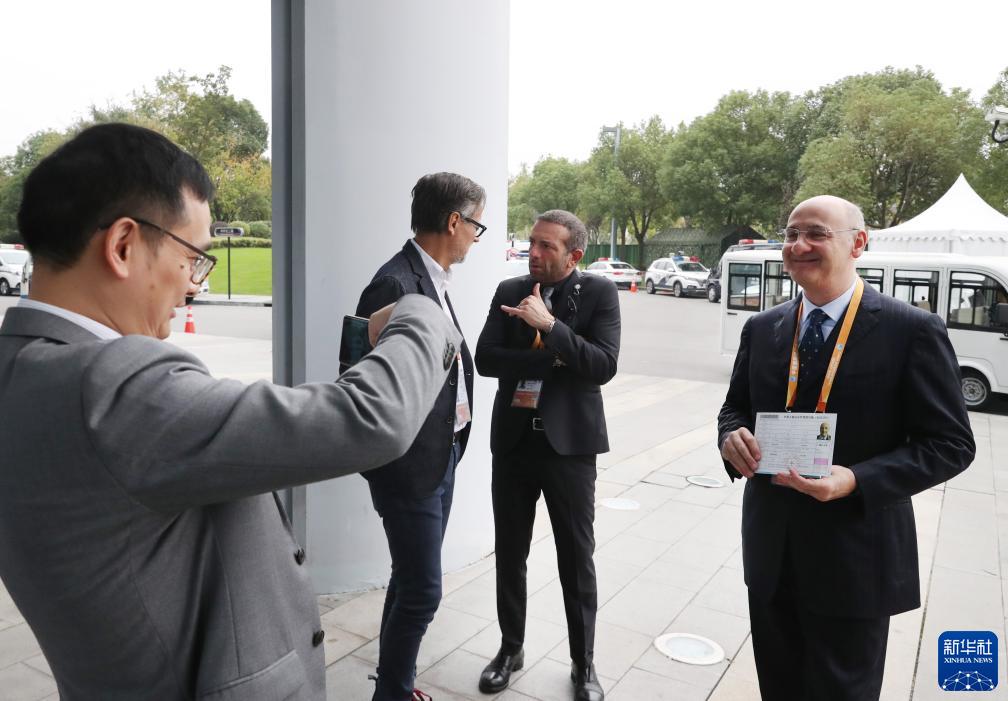 11月9日,同伴用手机帮手持签证回执的意大利参展商弗朗切斯科(右)拍照。
