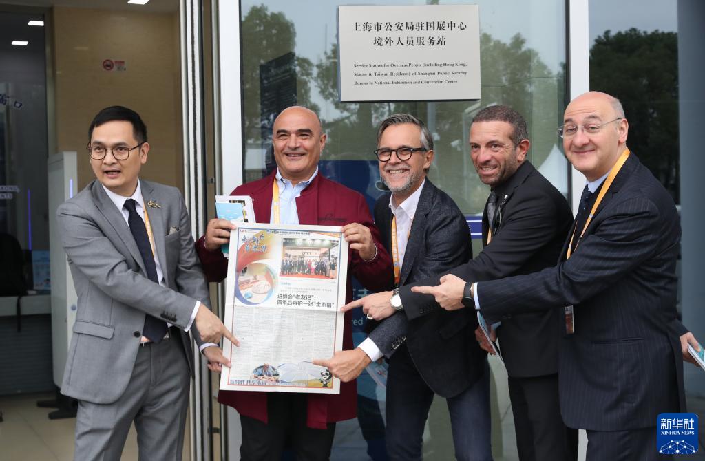 11月9日,在上海市公安局驻国展中心境外人员服务站,组团办理签证的意大利参展商手持有他们报道的本地报纸合影。