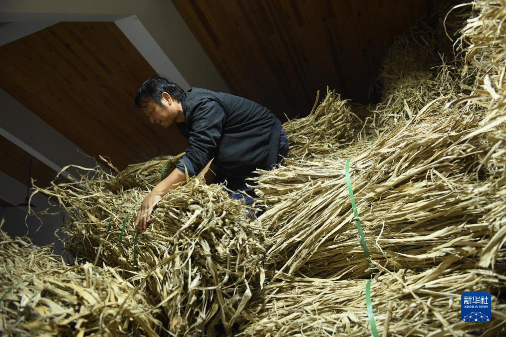 11月9日,在开化纸传统技艺工坊,黄宏健搬运制作开化纸的原料——荛花。