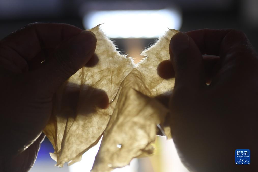 11月9日,在开化纸传统技艺工坊,黄宏健展示开化纸的纤维长度。