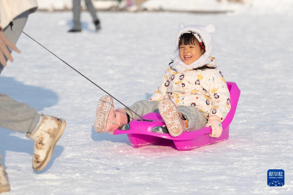 11月9日,小朋友在哈尔滨建筑艺术广场上游玩。