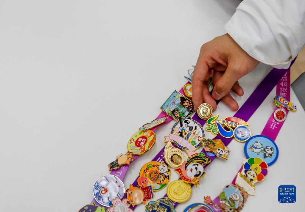 11月7日,在第六届进博会上,上海理工大学志愿者杨宇晨展示收集的徽章。近年,进博会“徽章文化”日益流行,在进博会上交换收集徽章成为不同高校志愿者、展商和参展者结交新朋友的方式。
