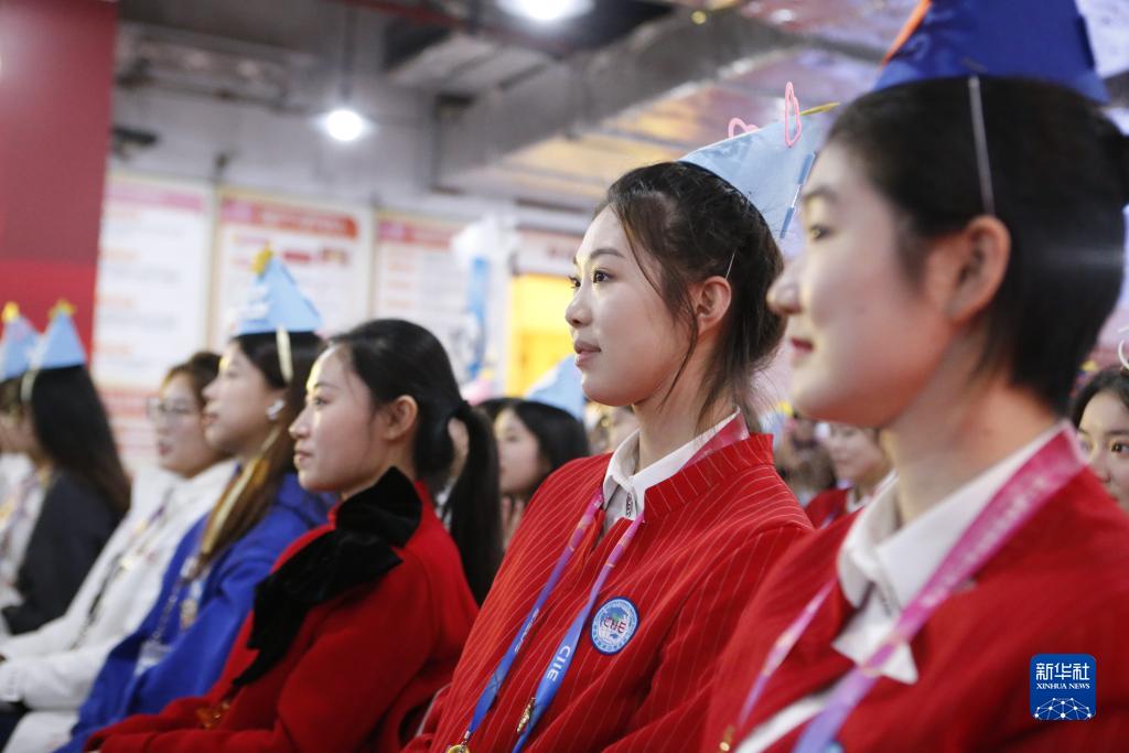 11月7日,在第六届进博会上,东华大学志愿者崔未骅(右二)在参加集体生日会。当日,进博会志愿者之家为进博会期间过生日的“小叶子”举办集体生日会,送上生日惊喜。