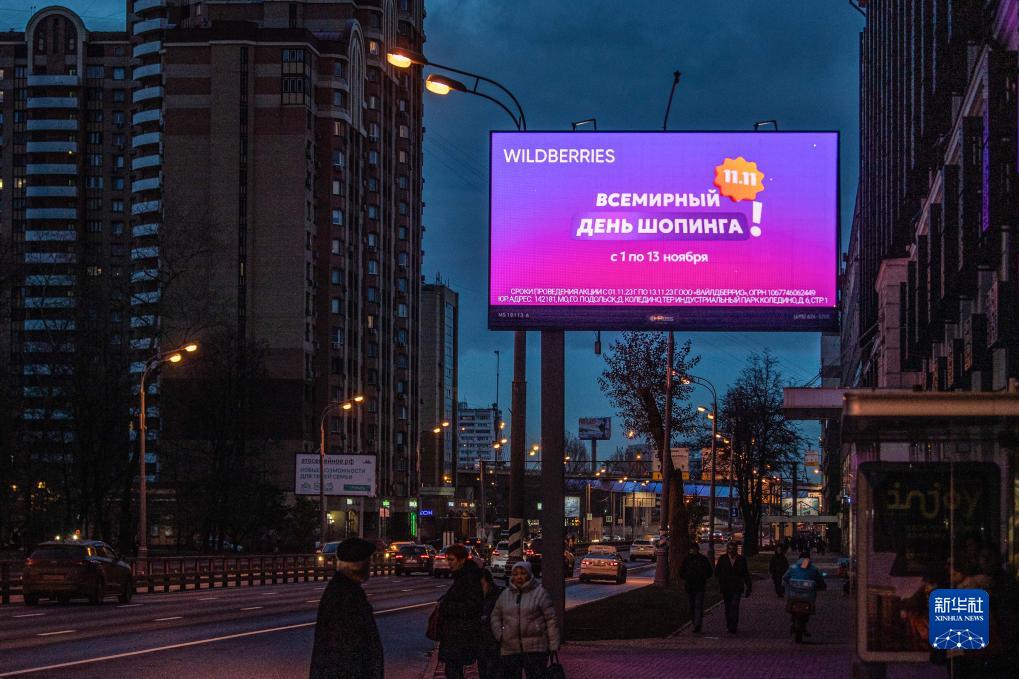 11月8日,在俄罗斯首都莫斯科,行人在播放电商平台“双十一”促销广告的显示屏前走过。
