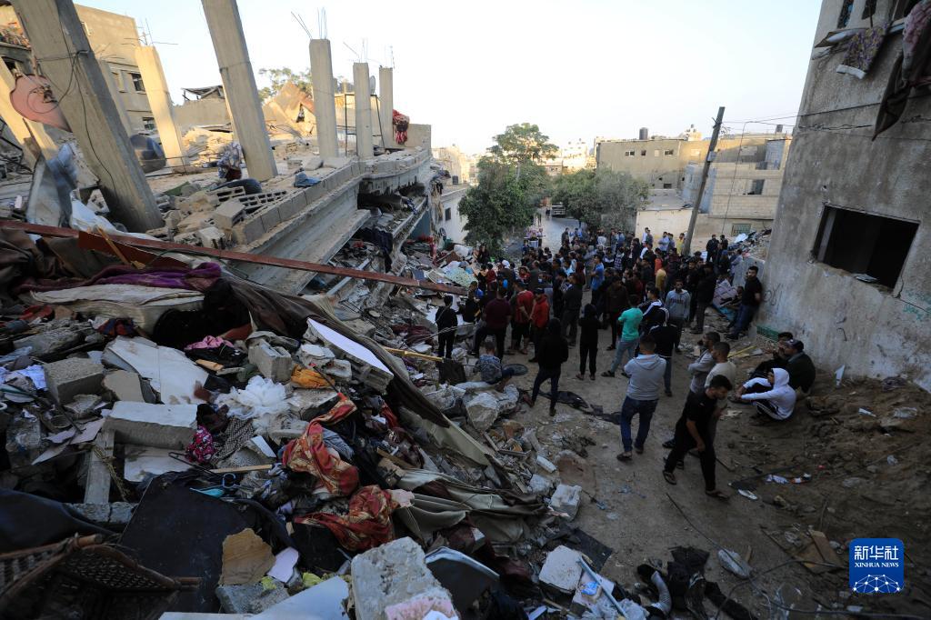 11月9日,在加沙地带南部城市汗尤尼斯,人们在遭以色列袭击后的建筑废墟中实施救援。