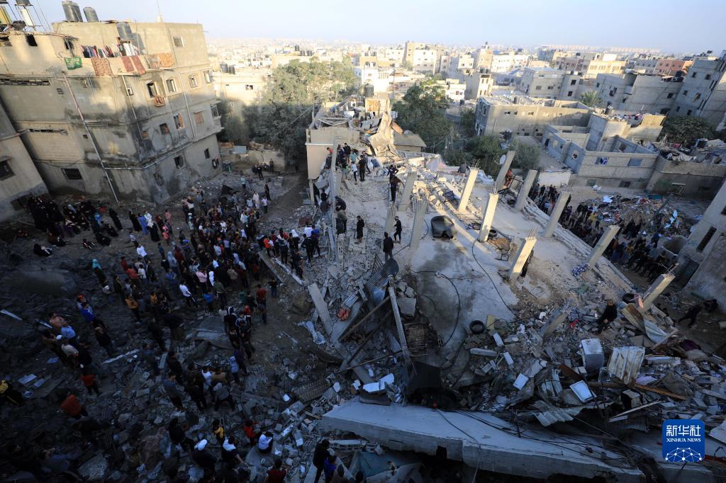 11月9日,在加沙地带南部城市汗尤尼斯,人们在遭以色列袭击后的建筑废墟中实施救援。