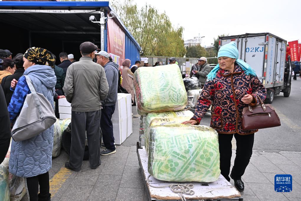 11月8日,在中哈霍尔果斯国际边境合作中心,哈萨克斯坦的游客将购买的货物打包发车。