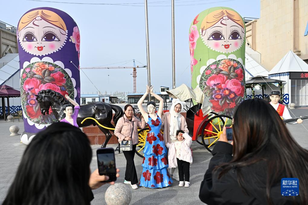 11月8日,游客在中哈霍尔果斯国际边境合作中心哈方区域打卡拍照。