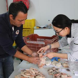 11月9日,在突尼斯本阿鲁斯,中国和突尼斯考古人员整理从遗址中发掘的陶器。