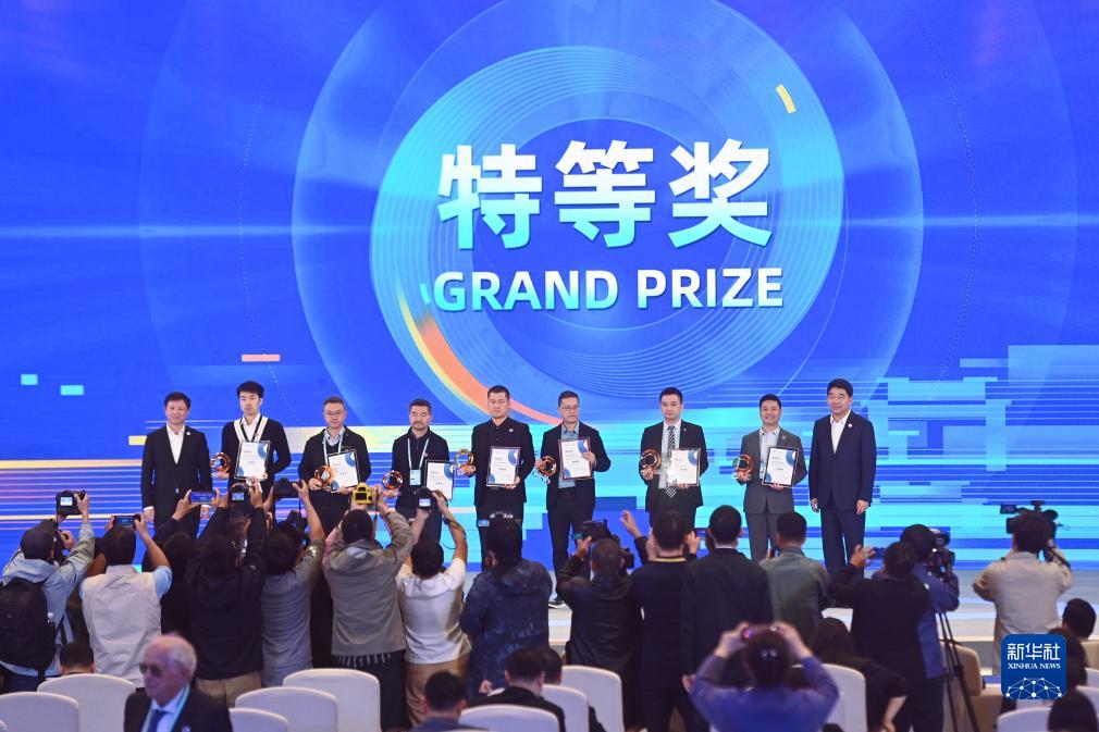 11月10日,获得2023“直通乌镇”全球互联网大赛特等奖的代表在颁奖典礼上。