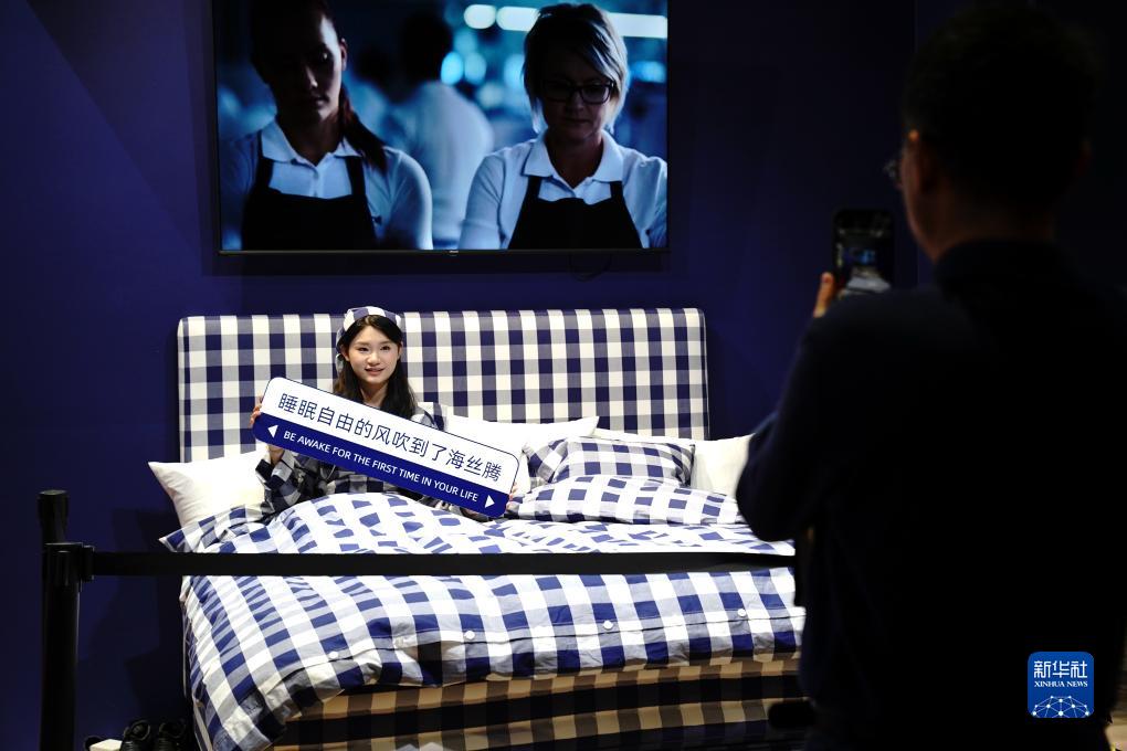 11月8日,在第六届进博会消费品展区,模特展示瑞典海丝腾床上用品。
