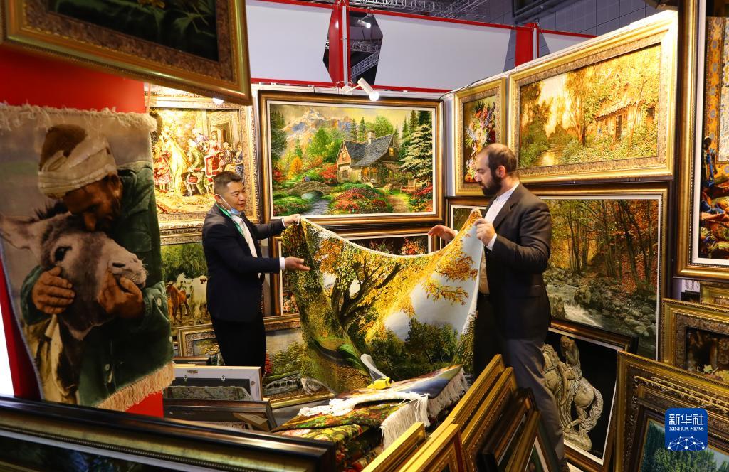 11月10日,在第六届进博会上,一名参观者在一家伊朗手工挂毯展位上查看一款风景画挂毯。