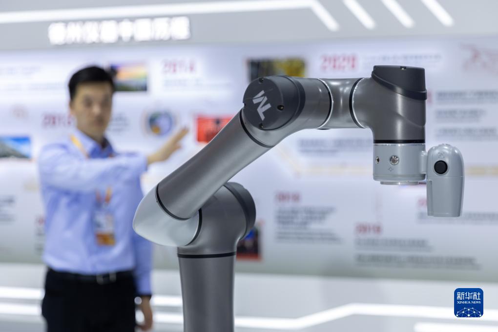 11月9日,在第六届进博会上,工作人员在德州仪器展位用手势控制协作机器人机械臂。