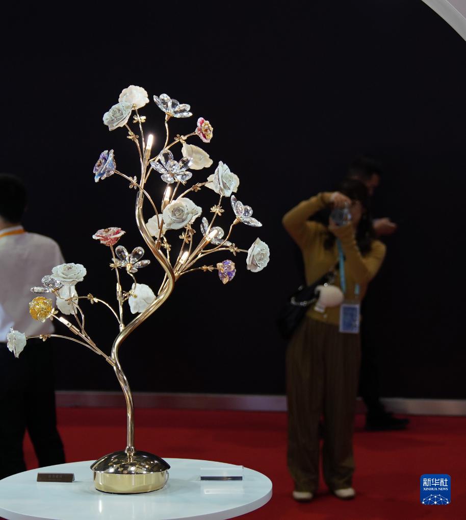 11月9日,在第六届进博会消费品展区,参观者在EJI(雅宝珠宝国际有限公司)展台拍摄展出的珐琅钻石花灯。