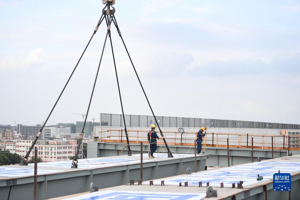 11月9日,工作人员在莞番高速吊装的钢箱梁上测量作业。