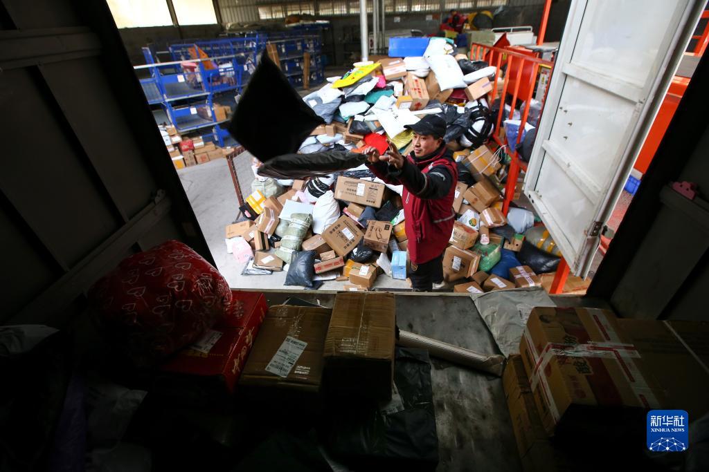 11月10日,济南市二环南路附近一家快递公司,工作人员在分拣中心忙碌。