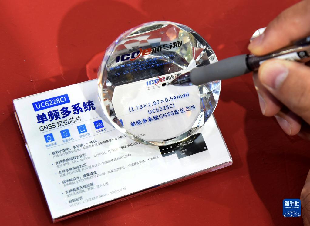 11月10日,一名参展商介绍基于北斗技术的国产微型定位芯片。