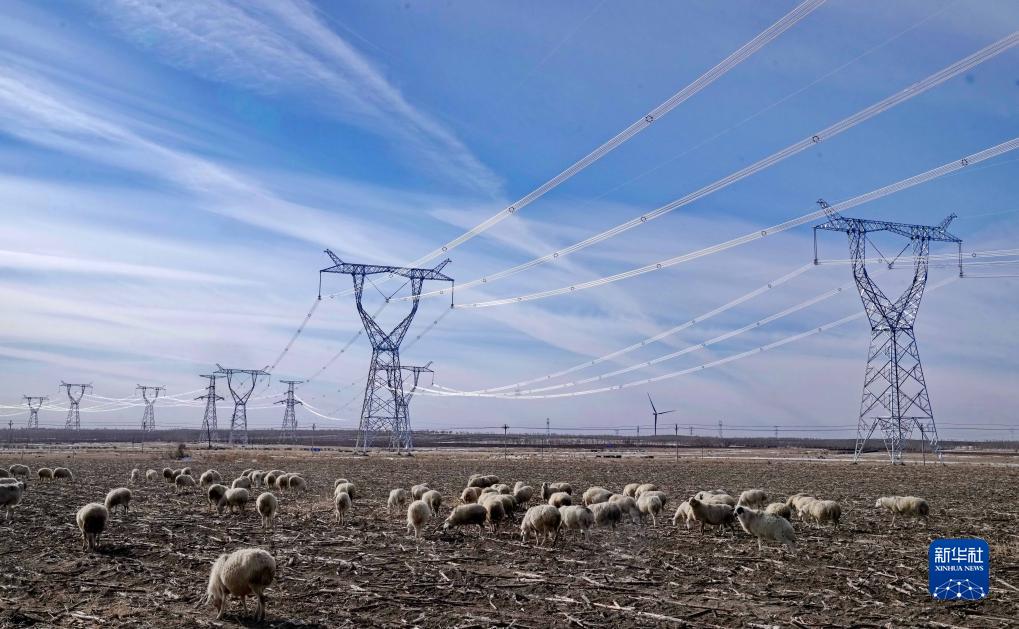 11月10日,一群羊在河北省康保县丹清河乡境内的张北至胜利双回1000千伏特高压线路工程冀北段建设工地附近觅食。