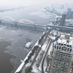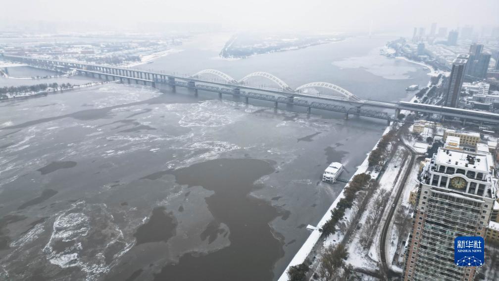 近日,随着气温下降,松花江哈尔滨段江面结冰速度加快。