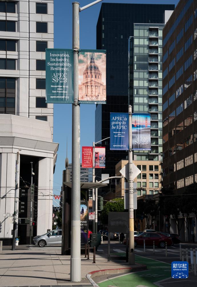 这是11月7日在美国旧金山拍摄的亚太经合组织会议场地外的宣传海报。
